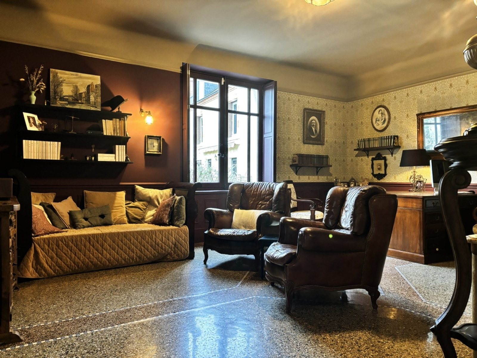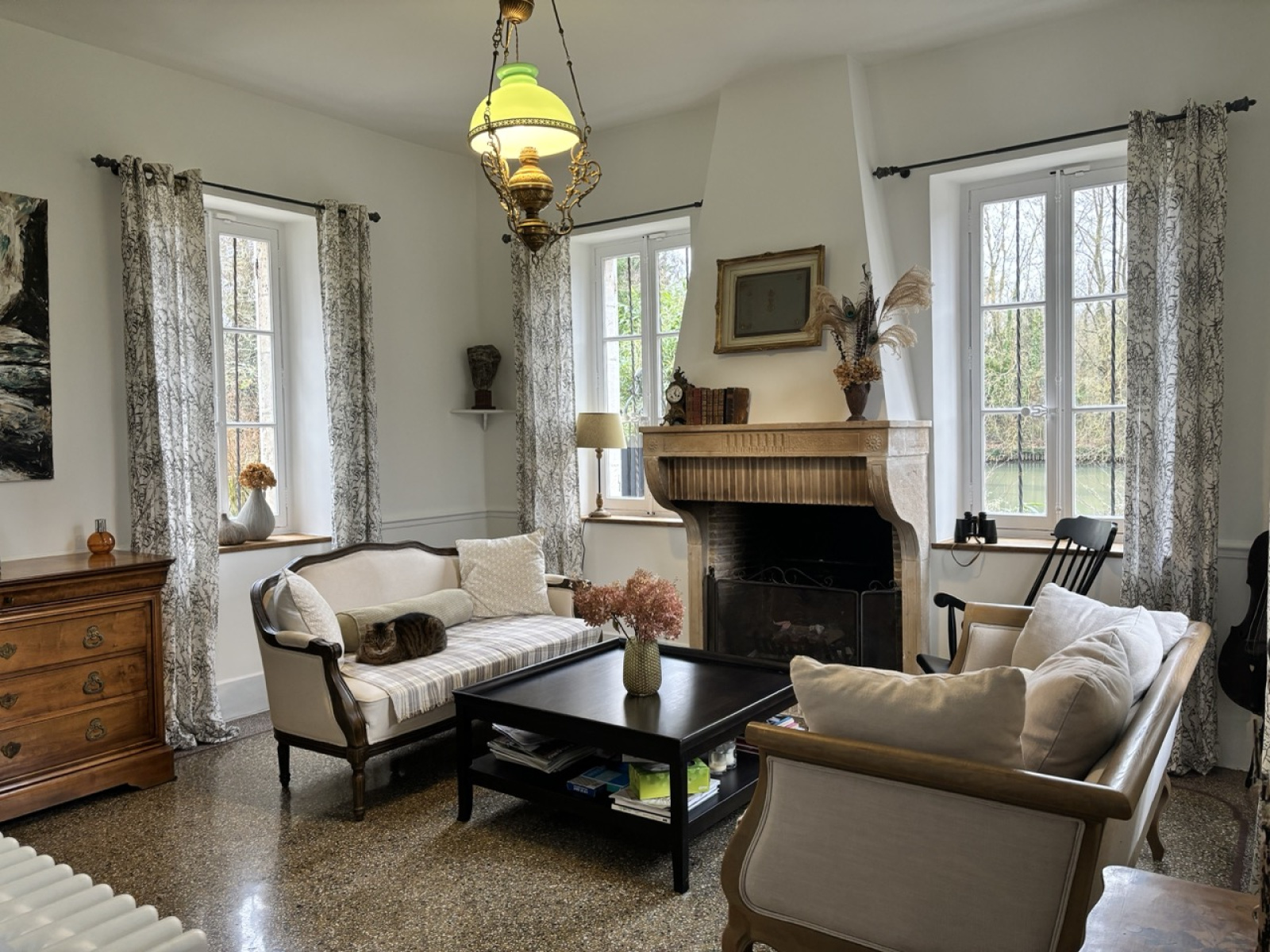 Dès l’entrée, les volumes généreux et la lumière omniprésente séduisent. Le salon principal, baigné de soleil grâce à sa triple exposition, offre une vue imprenable sur le Loiret. À ses côtés, un second salon, intime et feutré, rappelle l’élégance d’une bibliothèque anglaise.